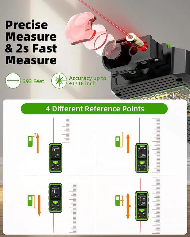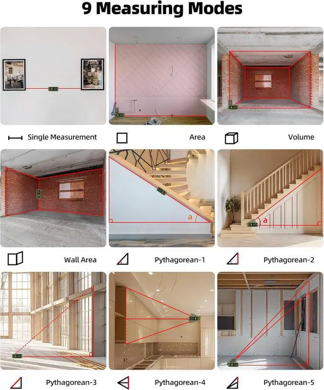 9-in-1 Multifunctional Measuring ToolThis laser measurer offers 9 modes, including length, area, volume, angle, wall area, and 4 Pythagorean modes. Features unit switching (M/In/Ft/Ft+In), 100 data storage groups, and add/subtract functions. Continuous measurement mode helps find midpoint, max & min values for precise results in construction & real estate
