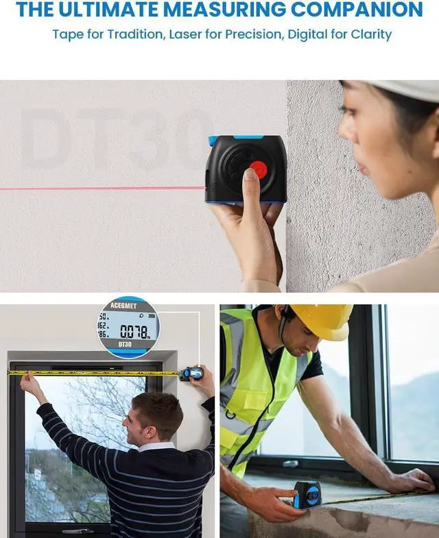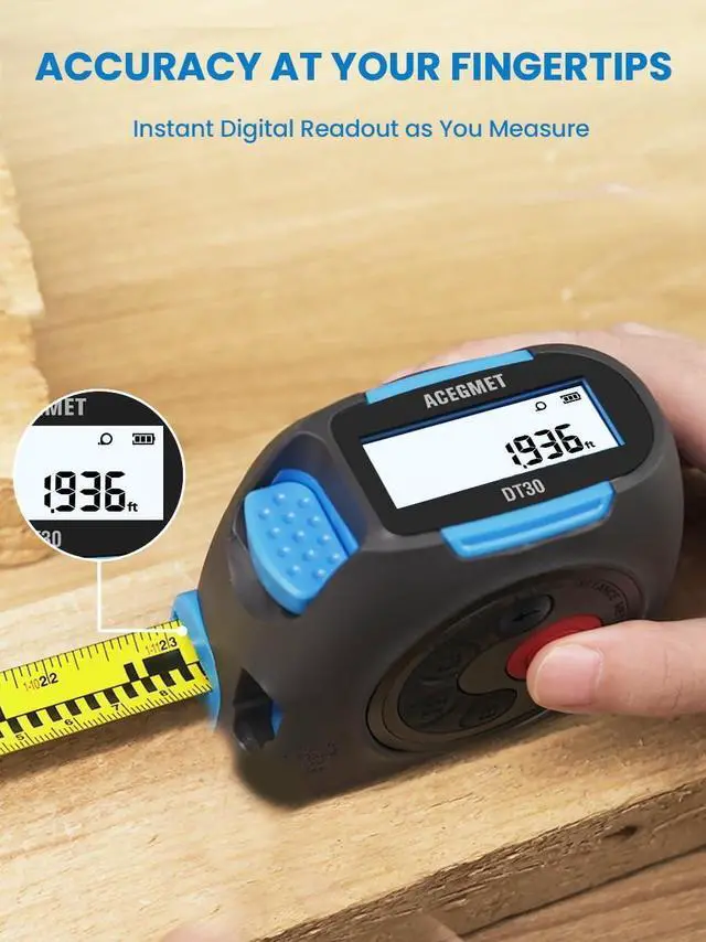 Introducing the DT30 Digital Tape Measure, a state-of-the-art measuring tool that combines traditional and modern technology to provide an unparalleled measuring experience. This 3-in-1 device includes a 16-foot tape measure, a real-time digital display, and a 130-foot laser measure, ensuring accuracy up to ±1/16-inch.
