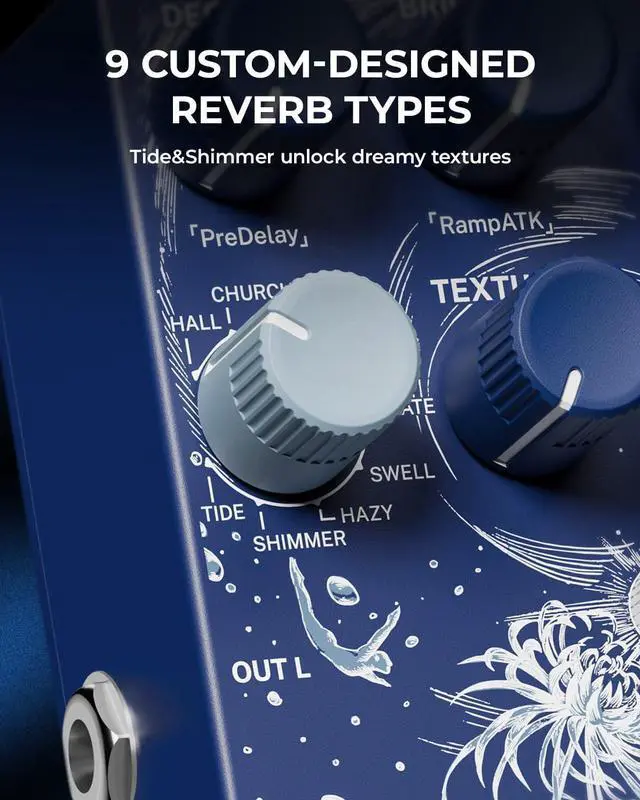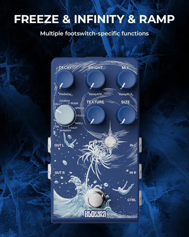 Endless Ambient Possibilities - Hold, layer, and sculpt sound without decay with Freeze & Infinity modes on the Klowra Limbo reverb pedal. A selectable Momentary / Latched behavior via the Texture control lets you match your playing style, whether you want instant, responsive holds or sustained pads that stay locked in place. Perfect for vast ambient oceans, swirling cinematic storms, or ethereal soundscapes