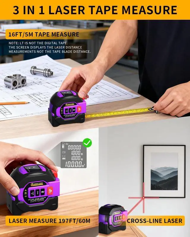 User-Friendly: Swap AAA batteries anytimeno dead-tool panic like with built-in lithium! The self-locking tape auto-secures measurements, while one-touch release saves your thumb. A jumbo LCD shows clear readings (even in sunlight! ), and the magnetic tip grabs metal pipes or studs. Store 40 measurements for grab-and-go accessspeed up your workflow!