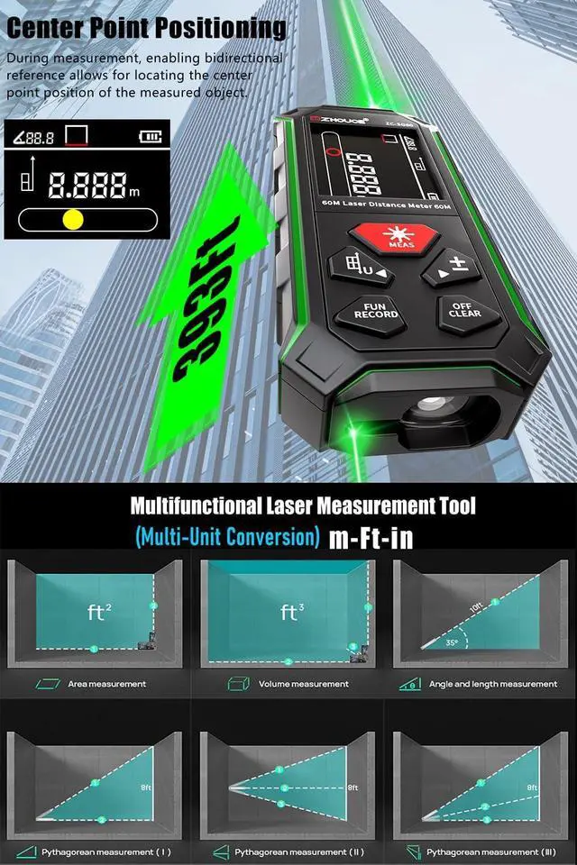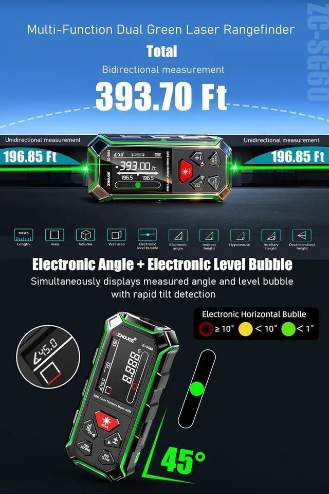 9 Modes + P2P TechnologyThe ZHOUCE ZC-SG60 meets every measurement need: Distance/Area/Volume/Angle/Wall Area + Pythagoras Mode, plus advanced Point-to-Point (P2P) technology for precise two-point measurements from a single location