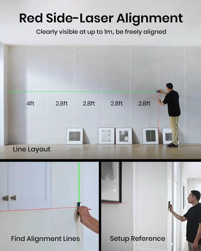 4 References & 8 Units - Flexible measuring made simpleswitch between 4 references (front, back, tripod, side-laser) and 8 units (ft, 0'00'' 1/32, 0'00'' 1/16, in1/32, in1/16, cm, m) with ease. The Red Side-Laser Alignment projects marking visible at 1m, helping you align, layout, and set up faster and more accurately.
