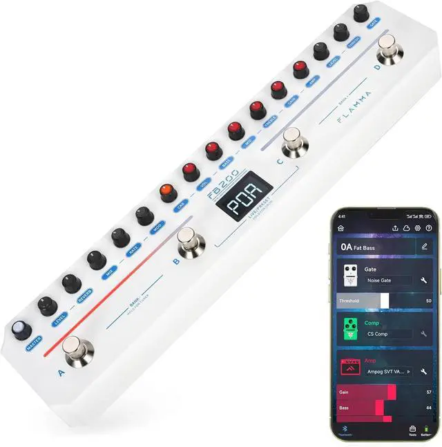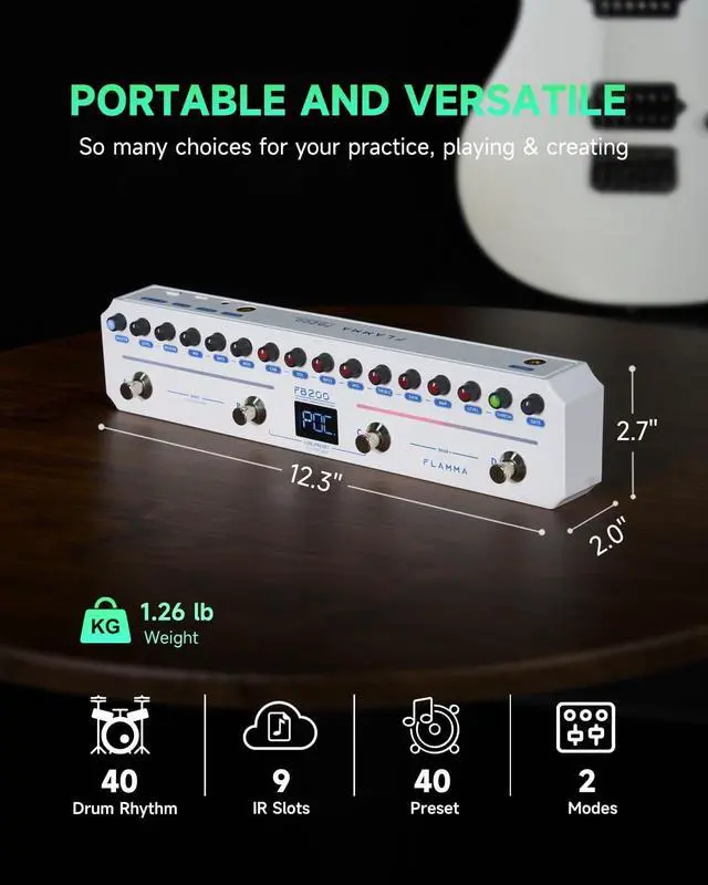 Includes a built-in drum machine with 40 common rhythm styles. Built-in tuning meter function. As well as isolated controls for three-band EQing, dynamic effects (including noise gates and gain).