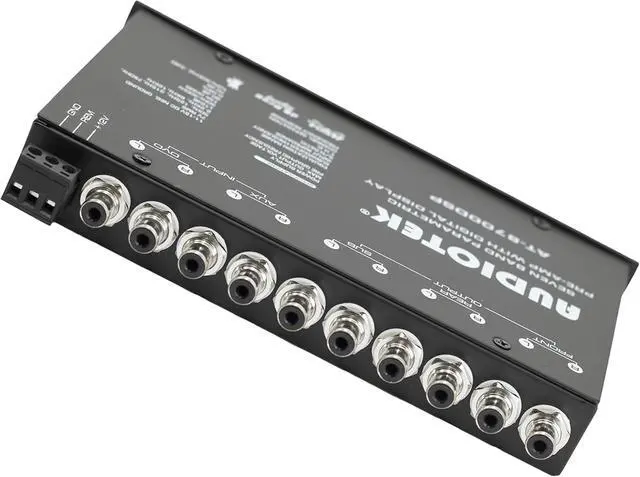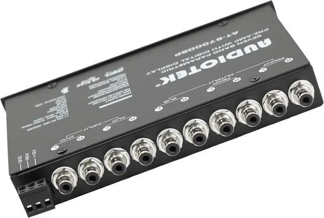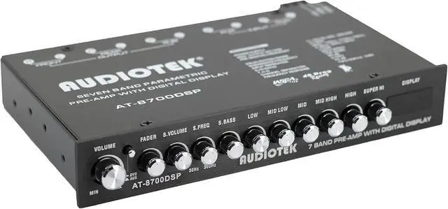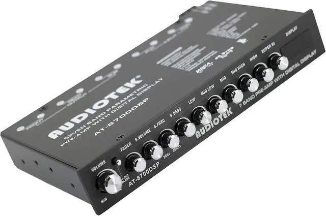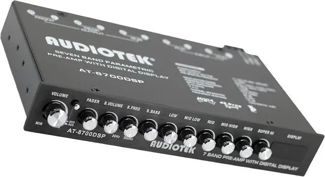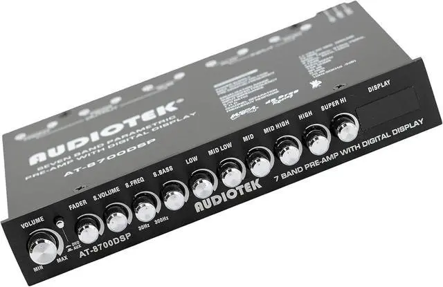 - Seven equalization bands (50Hz, 125Hz, 315Hz, 750Hz, 2.2 kHz, 6kHz, and 12kHz), each frequency is adjustable from -12 to + 12dB (-15 to +15dB for subwoofer frequencies) - Subwoofer output uses a built-in 12dB per octave electronic crossover fixed at 30Hz-300Hz - Three stereo RCA outputs to drive front, rear, and subwoofer audio amplifiers - An auxiliary stereo RCA input for use with portable devices, such as an MP3 Player or DVD player - Separate controls for master volume, subwoofer volume (sub level), front/rear fader, and selection of main or auxiliary inputs - Extended frequency response from 20Hz to 30kHz with exceptional 100dB signal-to-noise performance - Gold-plated RCA connectors to ensure the best audio signal output - ISO mounting holes and removable trim ring for custom installation Technical