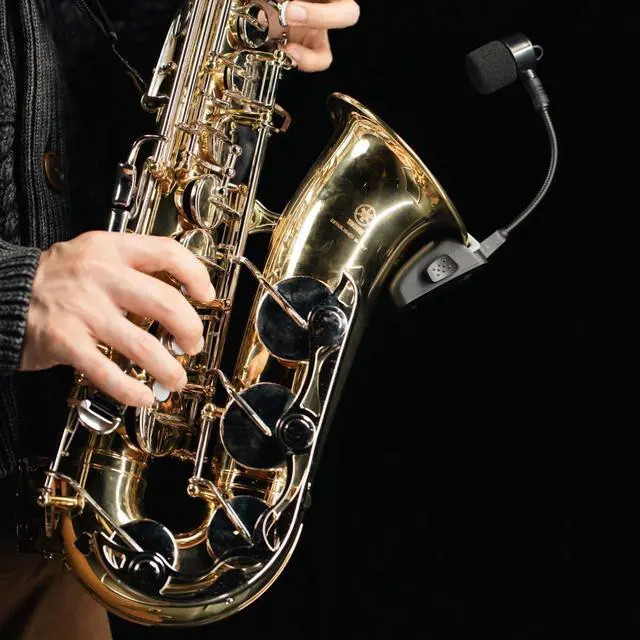 PATENTED SHOCK-ABSORBING GOOSENECK MICROPHONE DESIGNThe wireless microphone system for saxophones features a new shock absorption system to reduce resonance and handling noise in live settings. Its patented gooseneck design isolates the microphone from vibrations and clicks, ensuring pure audio focus on performance. Equipped with a custom unidirectional electret condenser microphone, it delivers precise sound capture optimized for wind instruments.