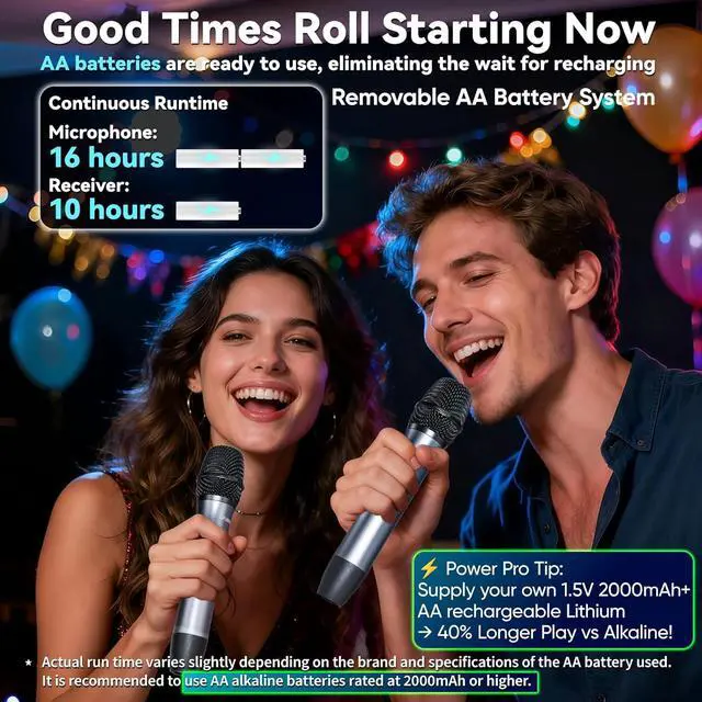 All AA Battery Design Safe, Convenient, and Long-Lasting. Each wireless karaoke microphone operates on two AA batteries, providing a runtime of 15 to 17 hours. The dual-microphone receiver is powered by one AA battery, offering a runtime of 9 to 11 hours. These figures are based on the included 1.5V 2000mAh alkaline batteries; actual runtime may vary with different battery types. The AFUOO professional wireless mic set recommends using 1.5V 2000mAh alkaline batteries for optimal performance. Please note that the included five AA batteries are non-rechargeable.