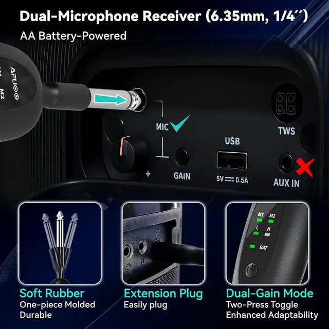 Versatile ApplicationsThe AFUOO W60 Pro wireless microphone set comes complete with two wireless microphones and a dual-mic receiver ( 6.35 mm), along with a 3.5 mm adapter for versatile compatibility with karaoke machines, PA systems, mixers, amplifiers. This dynamic wireless microphone is perfect for singing performance, karaoke, DJ performances, speeches, weddings, and parties, allowing you to unleash your passion and energy in any setting.