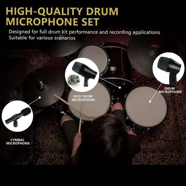 Wide use: The microphone is connected by xlr cable and can be compatible with any audio equipment with Mic in and XLR inputs. Seven-piece drum set micropphones are excellent choices for cymbals, jazzy drum, percussion, and other instruments, suitable for studio recording, stage performance, rehearsals, and shows.