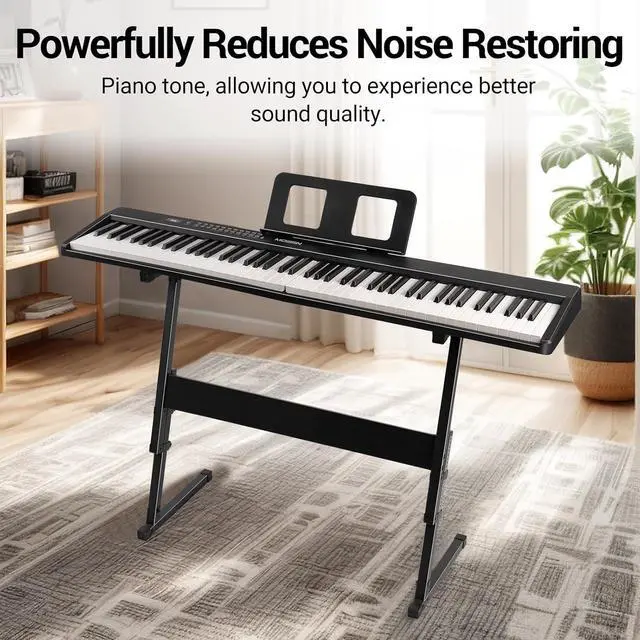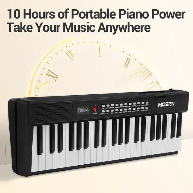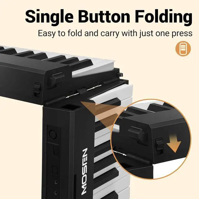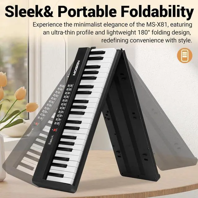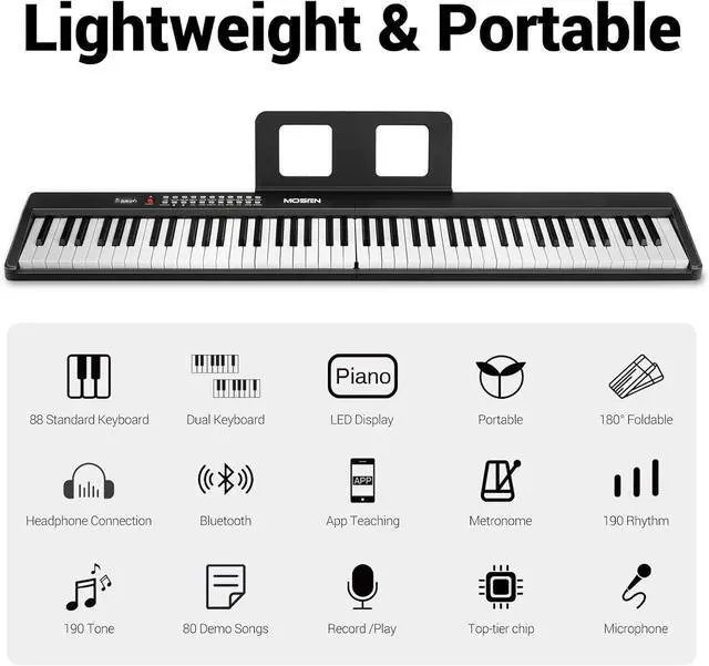 Product Description: The MOSEN 88-Key Full-Size Portable Foldable Semi-Weighted Piano Keyboard is crafted for beginners seeking a versatile, portable musical companion. Weighing just 7.8 lbs and folding to a compact 25.2" length, it prioritizes portability, fitting seamlessly into luggage or small storage spaces for travel or daily use. Equipped with 190 realistic tones, 191 dynamic rhythms, and 80 demo songs, this keyboard unlocks endless musical possibilities. Advanced features like auto-chord, split, record, and transpose functions elevate the playing experience, accommodating both new learners and more seasoned players. Designed to support growth, it includes dual keyboard mode, a metronome, and interactive teaching functions to refine skills efficiently. The included note/chord stickers provide visual aids, simplifying the process of learning notes and chords for beginners. Powered by a long-lasting battery, enjoy up to 10 hours of uninterrupted playtime on a single chargeperfect for home practice, outdoor sessions, or stage performances. The package arrives complete with essential accessories: a microphone, music stand, stickers, USB-C cable, and power adapter, ensuring you have everything needed to embark on your musical journey. Available in sleek black, this keyboard combines functionality, portability, and educational value in one compact design.