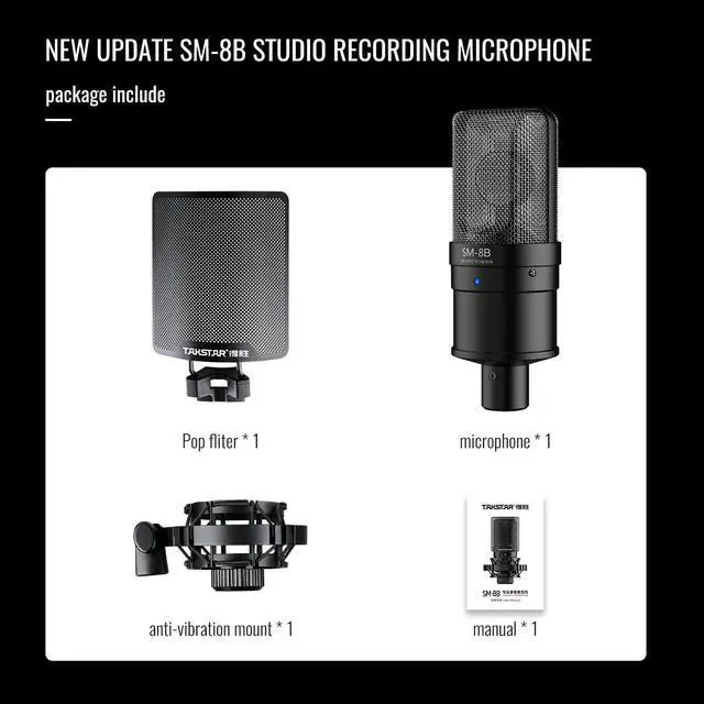 What You Get: SM-8B new recording microphone *1, anti-vibration mount *1, windscreen *1, User Manual*1. If you have any questions, please feel free to contact us.