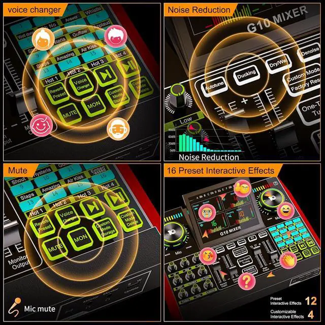 Rich Sound CustomizationThis audio mixer interface offers 4 voice variations and 16 built-in effects for live streaming. With professional functions, it covers all essential tools for sound editing, voice modulation, and dynamic content creation. Designed for streamers, podcasters, and gamers transform your audio instantly!