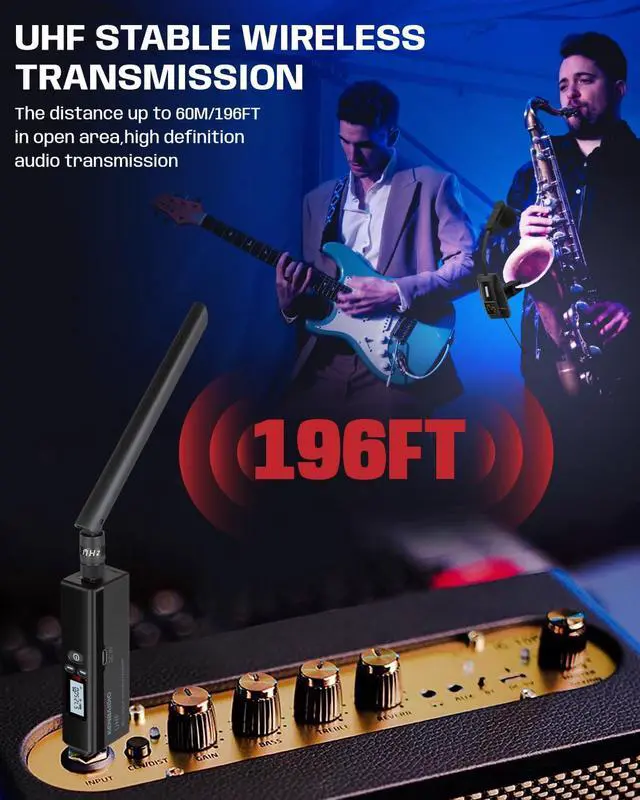Multi-Channel Flexibility: The wireless microphone transmitters & receivers offers 200 Adjustable UHF Channels (510-590MHz), ensuring stable audio transmission in complex or crowded wireless environments, preventing potential interferenceand supports up to more systems for use on the same occasion. Instrument mic ideal for live performances with multiple instruments or performers.