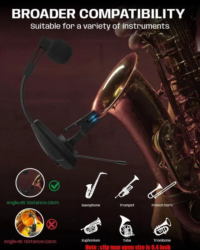 Super Battery Life & Portable Storage Case: The clip-on instrument microphone for sax and trumpet built-in lager rechargeable lithium-ion battery, 2-3 hours charge, 6 hours available. The transmitter and receiver can be charged simultaneously via the 2 in 1 USB charging cable. The compact and lightweight wireless saxophone microphone set comes with a portable storage case for easy carrying and reliable safety.