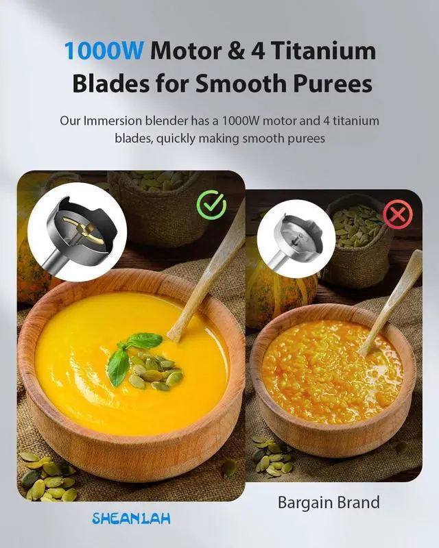 4-Blade Titanium HeadOur immersion blender features a 4-blade titanium head for superior performance. Compared to standard 2-blade designs, it blends more efficiently, This cutting-edge design not only improves blending efficiency but also extends the lifespan of the blades, making it a reliable choice for all your culinary needs.