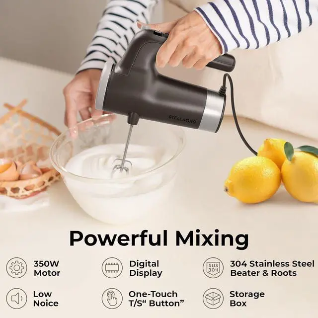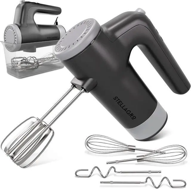 VERSATILE ATTACHMENTS & EASY EJECT - Stellagro hand held electric mixer includes storage box with stainless steel 2 x flat beaters, 2 x dough hooks and 2 x whisks for a variety of recipes. One-button eject makes cleanup quick and easy.