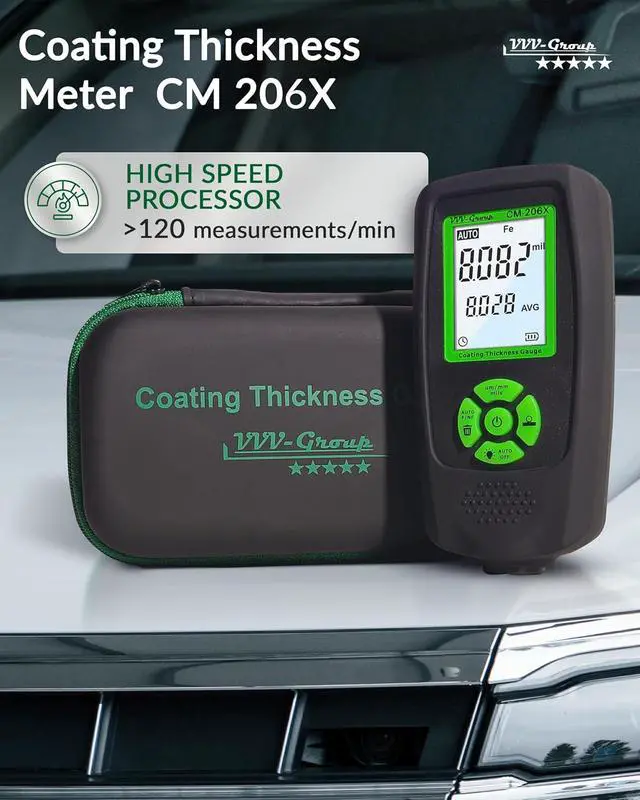 HIGH-SPEED PROCESSOR UPDATED FOR 2025 The CM-206X coating thickness meter is equipped with an upgraded processor capable of over 100 measurements per minute. With no delay in readings, this paint meter car tool delivers instant results, making inspections faster, smoother, and more efficient for automotive experts and buyers.