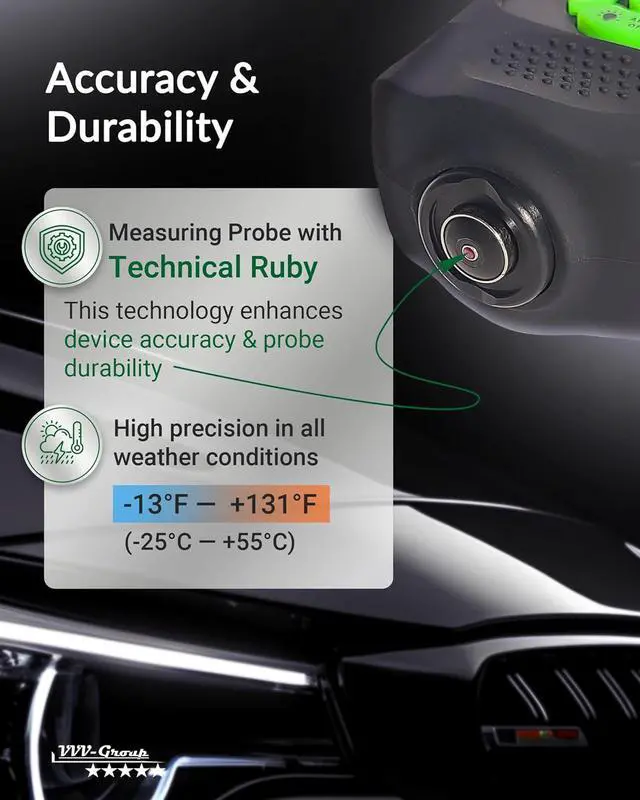 ADVANCED RUBY PROBE WITH SURFACE PROTECTION Equipped with a ruby probe featuring protective coating, this paint thickness tester prevents scratches and guarantees accurate readings. The self-adjusting measuring head ensures reliability by compensating for small positioning errors, making this paint mil thickness meter gauge precise and durable in professional use.
