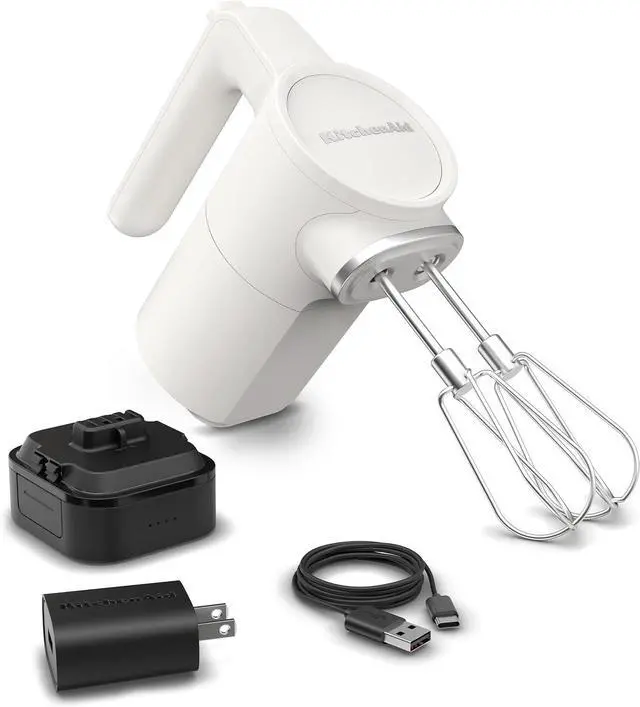 Model KHMR762 includes (1) Cordless hand mixer, (2) Dishwasher-safe stainless steel turbo beater II accessories, (1) 12v MAX removable battery, (1) USB-C cable, (1) Wall adapter