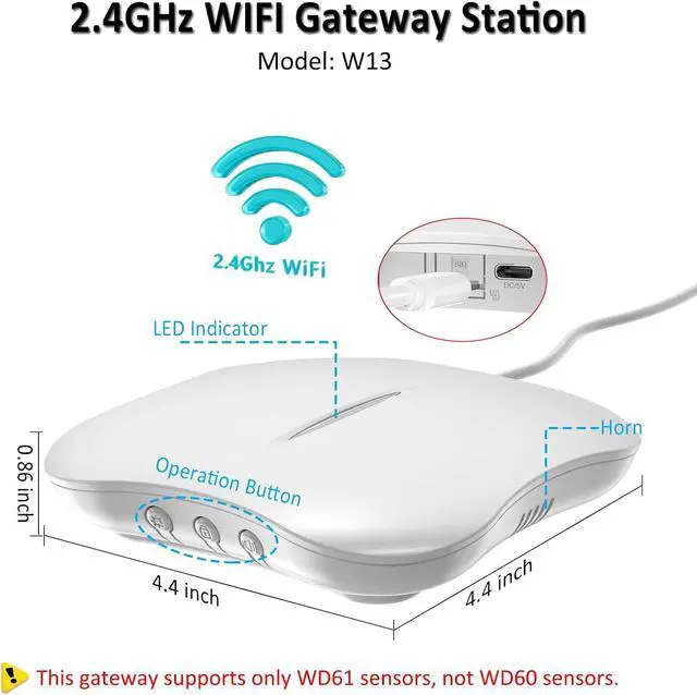 [Notice 1] The Gateway (Model: W13) in this product only supports expanding WD61 model sensors, it cannot expand WD60 model sensors (for example, ASIN: B0CKYTP2DM / B0B639K2HL in this store, these WD60 Sensors don't have Bluetooth and WiFi function).