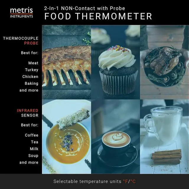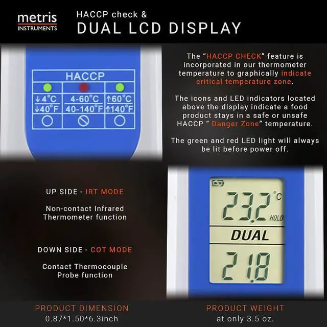 ACCURATE INTERNAL AND SURFACE READINGS - The readings conform to HACCP food safety accuracy within +- 1.8 °F from 32° to 150°F for infrared accuracy and +- 0.9 °F ( 0.5 °C) probe accuracy. It has a distance to spot size ratio: