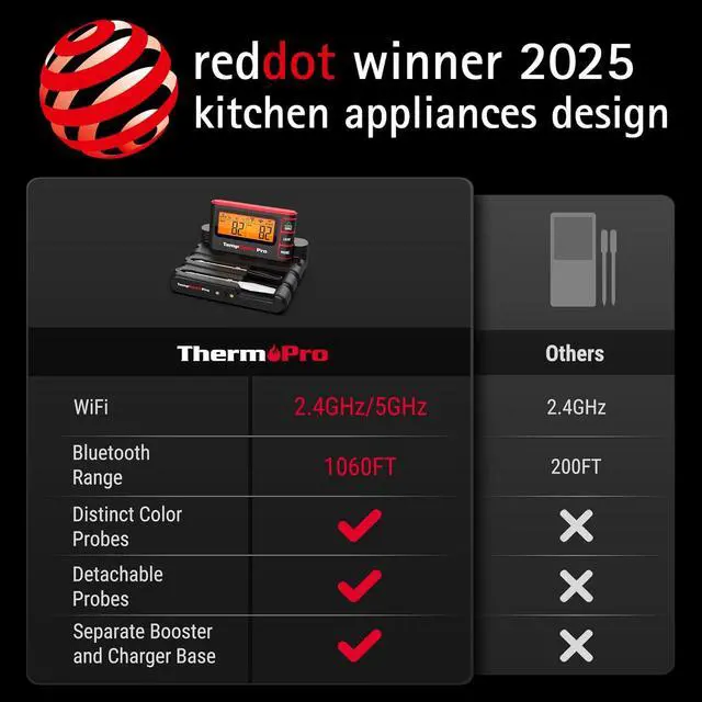 Color-Coded Thinner ProbesThe thinner probe preserves meat juices and presentation, ensuring your food looks great and tastes amazing; Color-coded probes for easier identification, quickly tell which probe corresponds to which piece of meat even in smoky environments through this wireless meat thermometer for grilling and smoking
