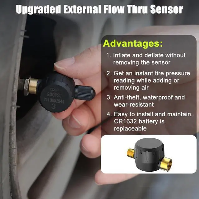 Flow-Thru Sensor Design for Effortless Maintenance: This upgraded trailer TPMS features 8 rugged Flow-Thru sensors that allow inflation without removing the sensorsaving time during tire checks or refills. The tire pressure sensor is IP67 waterproof, designed for metal valve stems, the durable brass nozzle resists wear, extreme heat and high pressure. The externally mounted sensors install in minutes and are built to withstand harsh road conditions. Users can easily replace the long-lasting CR1632 batteries, eliminating costly professional servicing. Ideal for commercial fleets or frequent travelers needing reliable, low-maintenance monitoring