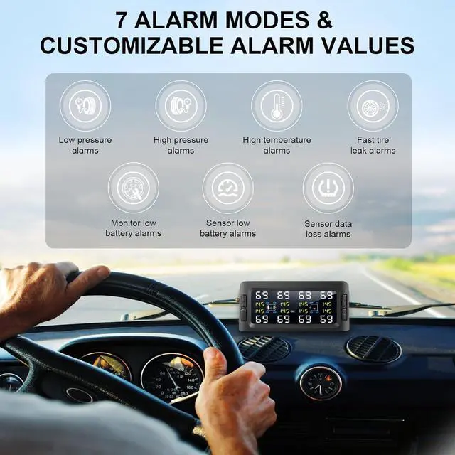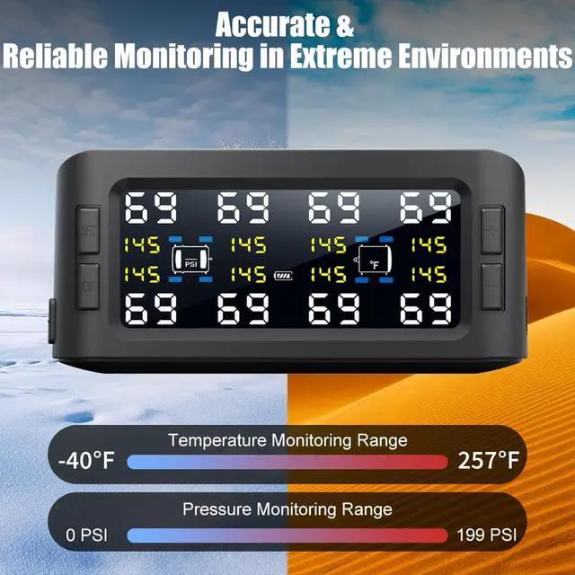 Full Protection: Stay ahead of risks with audible/visual alarms for: high/low pressure (0-199 PSI range), tire overheating, rapid air loss, sensor/monitor low battery, and sensor malfunctions. Extend tire lifespan, improve fuel efficiency, and enhance driving safety