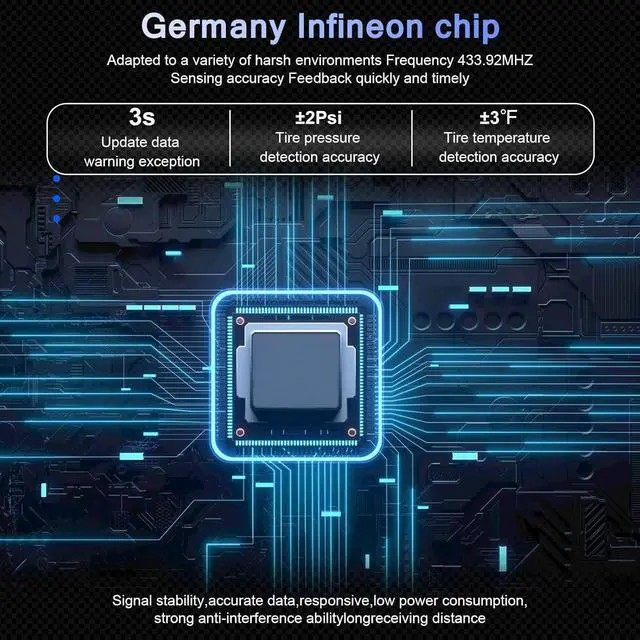 Adopting Infenion Chip & Smart Auto-Wake Technology: The trailer tire pressure monitor adopts the German Infenion chip, which has high monitoring accuracy and rapid feedback. The data is updated every 3 seconds. Its smart wake/sleep mode eliminates manual operationautomatically activates when driving and enters energy-saving sleep after 15 minutes of parking