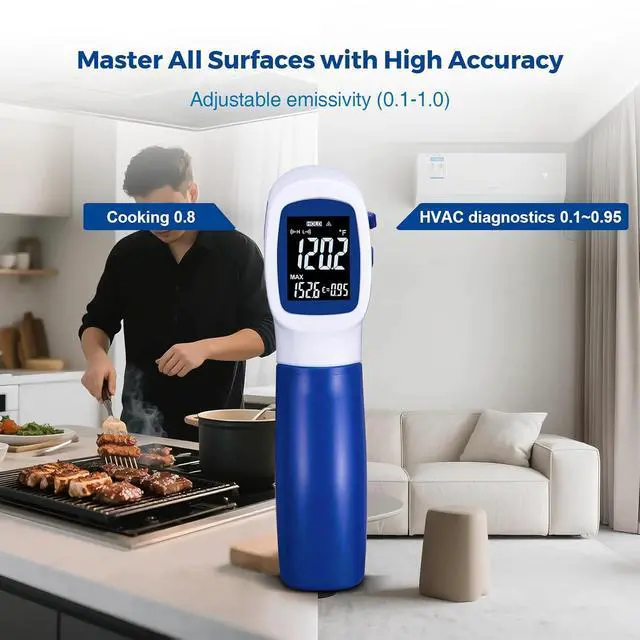 Adjustable Emissivity Accurate Across Materials: With 0.11. 0 emissivity settings, this Thermal Gun provides accurate readings across food, liquids, metals, cookware, and industrial surfaces, making it versatile for kitchen, HVAC, and workshop use
