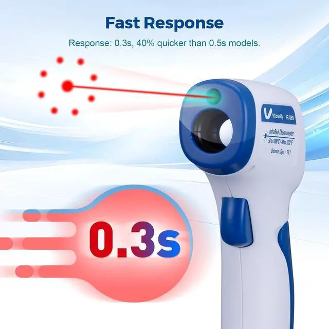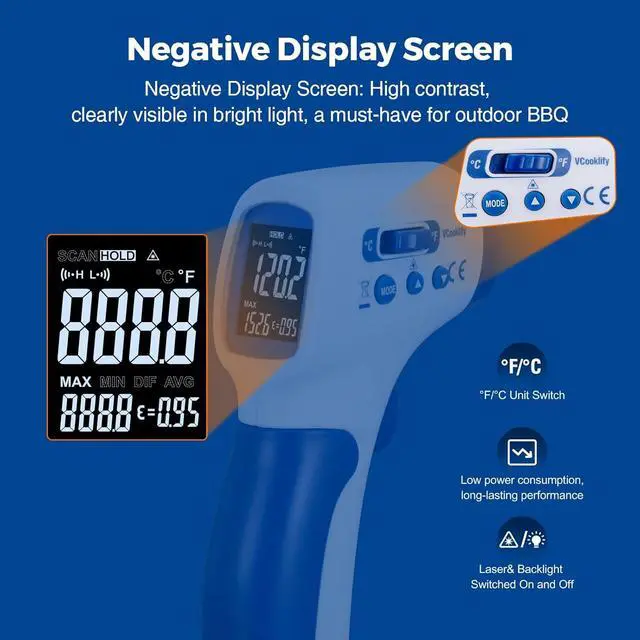 Laser Targeting & Backlit Display: The laser temperature thermometer uses a ring laser for precise aiming and a backlit reverse LCD screen for easy temperature reading even in dim kitchens or outdoor BBQ setups