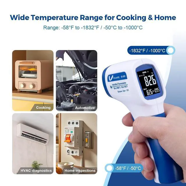 Wide Temperature Range From Cold to High Heat: This temp gun measures -58°F to 1832°F (-50°C to 1000°C) with easy °F/°C switching, making it ideal for frying, cooking, BBQ, or other high-heat tasks