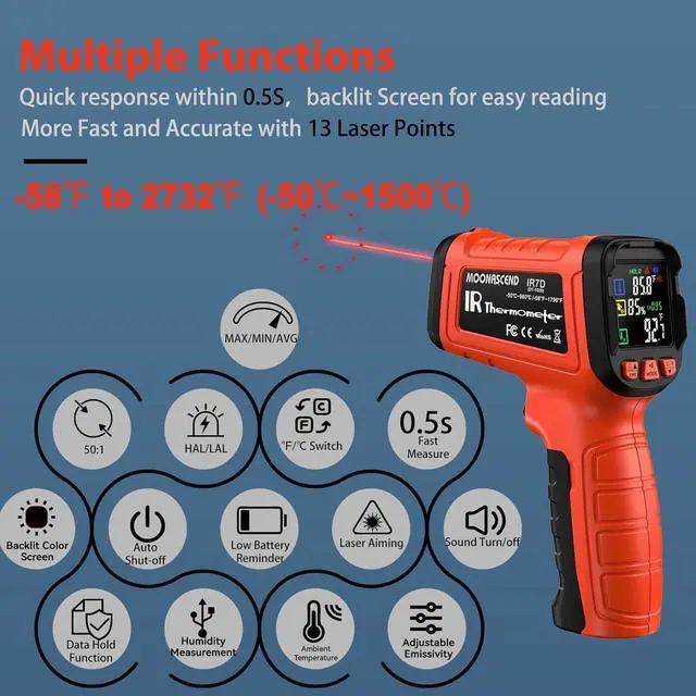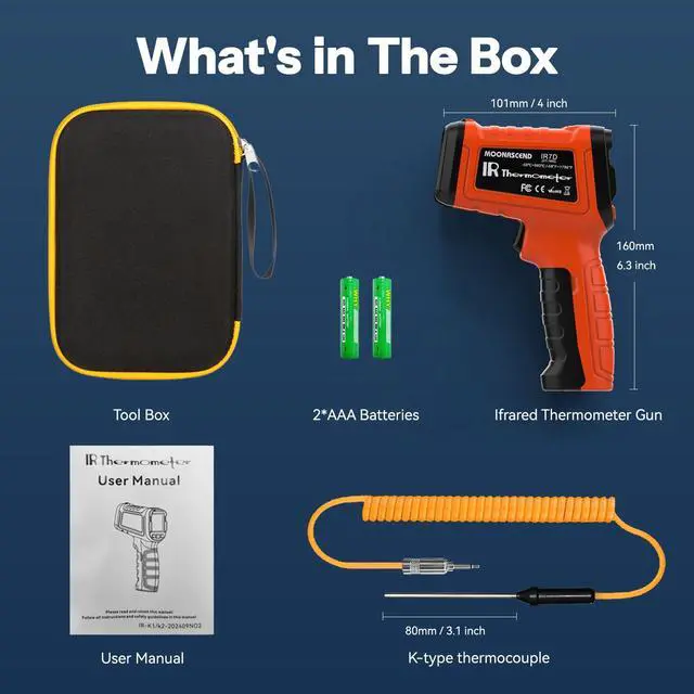Comprehensive Customer Support & Package Contents: MOONASCEND is dedicated to providing fast and professional customer support, with a 24-hour response time for all inquiries. The package includes an infrared thermometer, K-type thermocouple probe, storage bag, 2 AAA batteries, and a user manual.