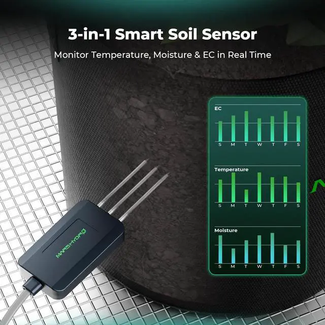 Soil Sensor Monitor Root Zone Health: Get precise readings of soil temperature, moisture, and EC (Electrical Conductivity). By inserting the probe horizontally into the soil, it accurately tracks key parameters like moisture, temperature, and nutrient levels. This enables data-driven irrigation and fertilization plans, promoting healthier root development and preventing over-fertilization.