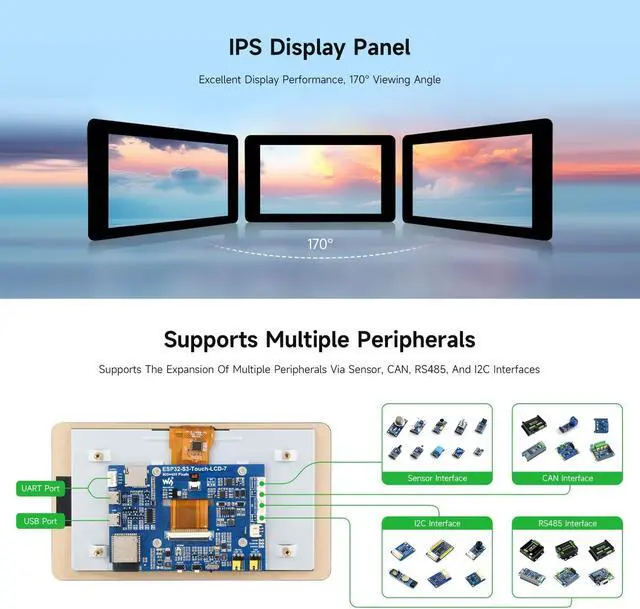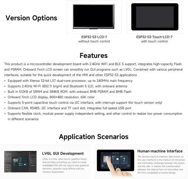 [Various Peripheral Interfaces] Combined with various peripheral interfaces, suitable for the quick development of the HMI and other ESP32-S3 applications. Supports flexible clock, module power supply independent setting, and other control to realize low power consumption in different scenarios