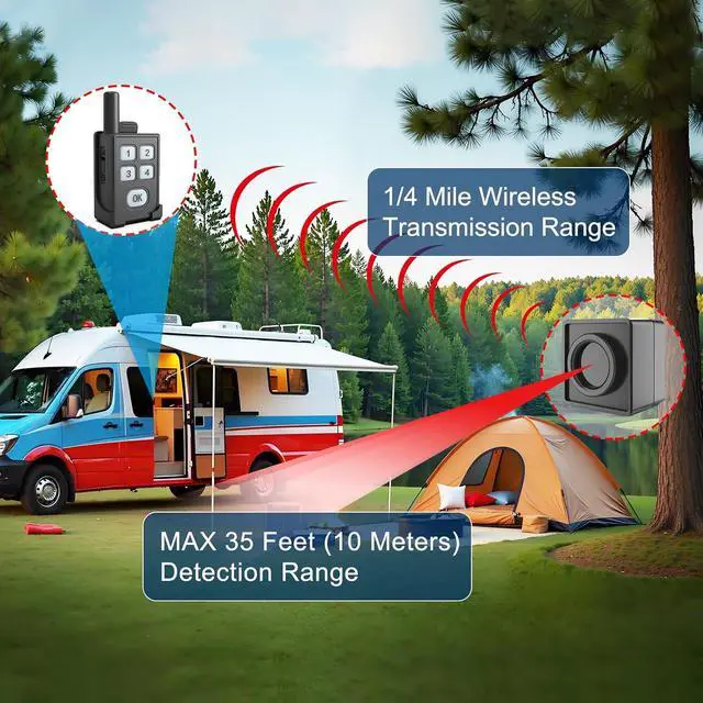 [1/4 Mile Long Wireless Range] The wireless connection range between the detectors and the portable alarm receiver is up to 1/4 mile (actual range will vary depending on the local terrain). Perfect for sprawling campsites or securing approaches. The detection range of the motion sensors is up to 35 feet. Advanced PIR motion sensing optimized to detect larger moving objects (people, big animals) while minimizing false alarms from small critters or swaying vegetation