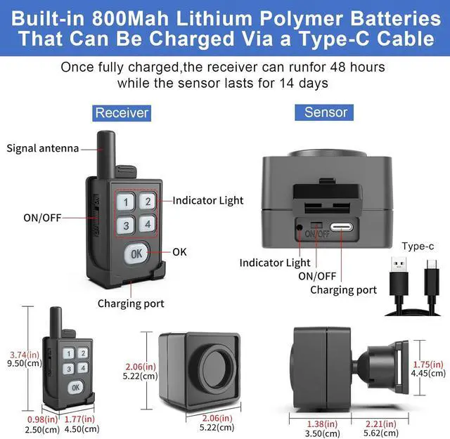 [Long-Lasting Battery Life] [DIY Outdoor Security] Both the motion sensor and the portable receiver are powered by the built-in rechargeable batteries offering extended operation (portable receiver: working 48 hours once fully charged/ motion sensor: working 14 days once fully charged), ensuring reliable protection throughout your trip without constant recharging worries