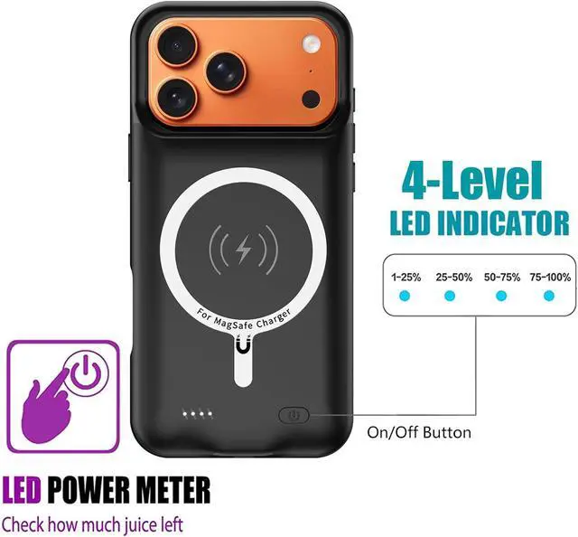 LED POWER INDICATOR: This for iPhone 17 Pro Max battery pack the features of 4 LED battery level indicator letting you know exactly the power you have (25%--50%--75%--100%); besides, you could switch on/off the battery case with the power switch button on the bottom.