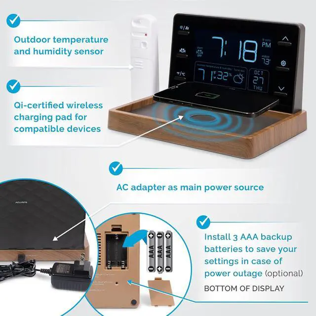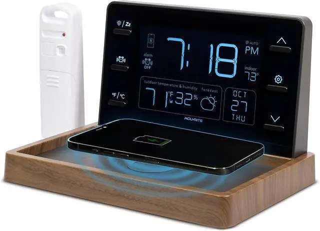 Optimize your home! The Weather Valet with Wireless Charging Pad and Alarm Clock (02047) wakes you up with charged devices and a wealth of weather knowledge to start your day! It features a wireless charging pad for Qi-equipped smartphones or earbuds that doubles as space for keys, spare change, or other pocket-sized items. Plus, the auto-dimming display provides a personalized forecast 12 hours from current conditions thanks to an included wireless sensor in your backyard. It also provides the outdoor temperature and humidity, indoor temperature, date, and time in easy-to-read, large digital numbers.