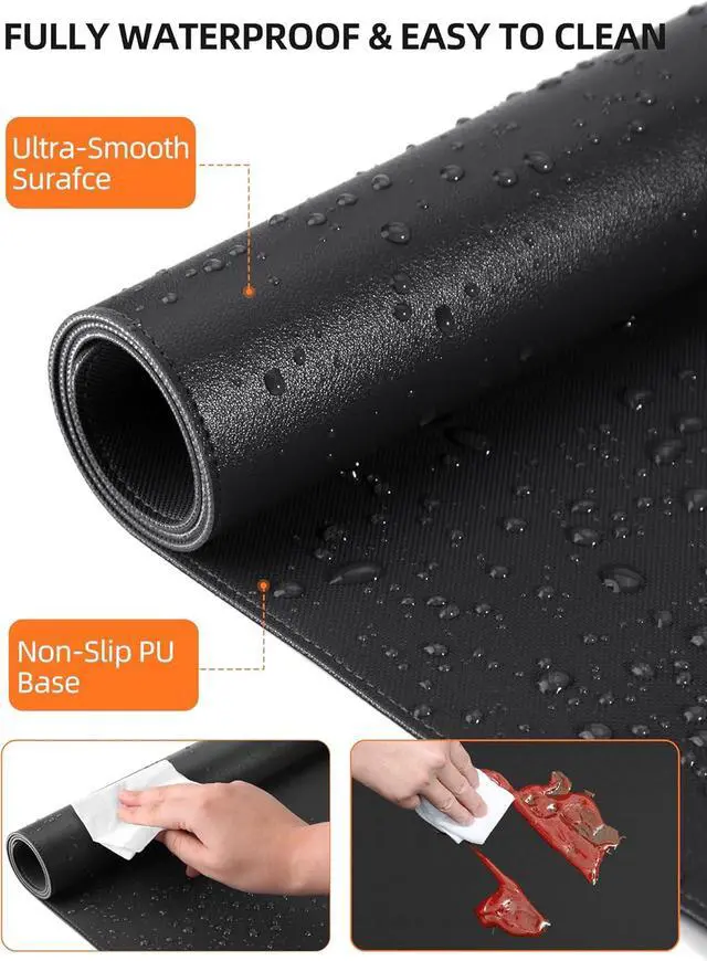 Ultra-Smooth & Waterproof SurfaceThe surface of this gaming mouse pad is made of smooth and durable PU leather, the texture is close to genuine leather, which not only ensures that you can control your mouse accurately and glide smoothly, but also protects your desktop from scratches, stains, spills, high temperatures, and abrasions, and you only need to wipe the surface with a rag when cleaning