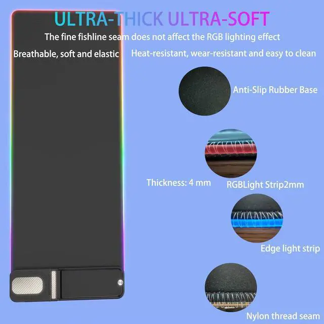 Phone Holder: RGB mouse pad with wireless charging made of super luminous material and can be customized with 7 lighting modes. Create a dinctive atmosphere while playing games or working with a RGB mouse pad. The memory function hs to rem your last light mode choice when switched on. One button controls all light modes, press once to switch light color, long press to switch light modes. The wireless charging function and RGB lighting can work separately