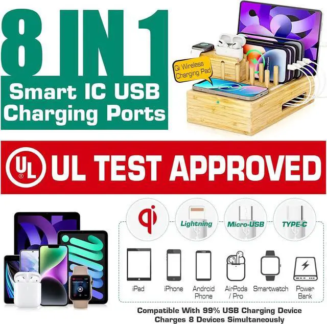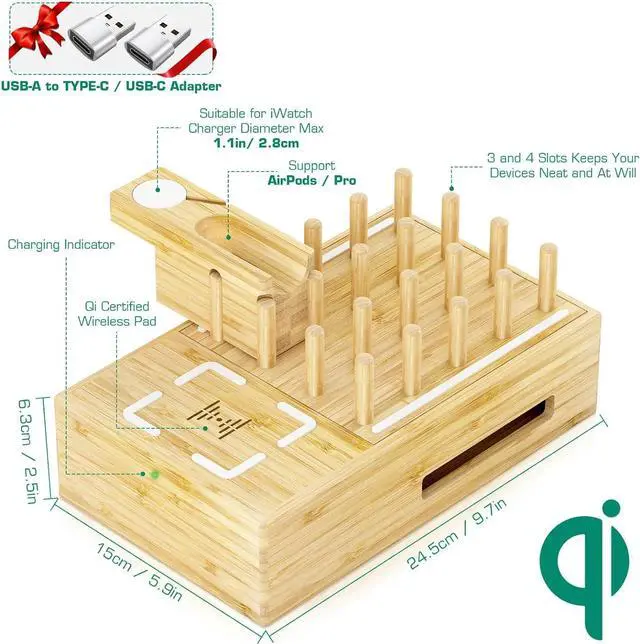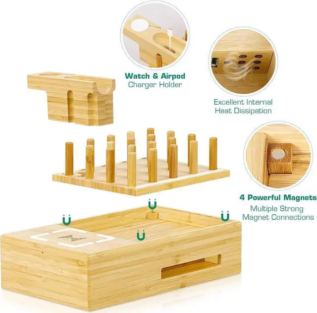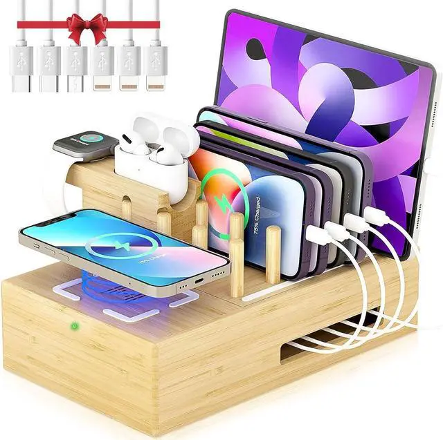 HUMANIZED DESIGNMade of 100% natural bamboo, environmentally friendly, and durable. Anti-skid strips on the wireless pad and both sides of slots ensure your devices staying safely. Four white silicone gaskets on the bottom will keep your docking station sitting on the desk firmly. The light indicator in front of the charging station will tell you the status of the power easily. 6 mixed cables will make you charge the devices conveniently.