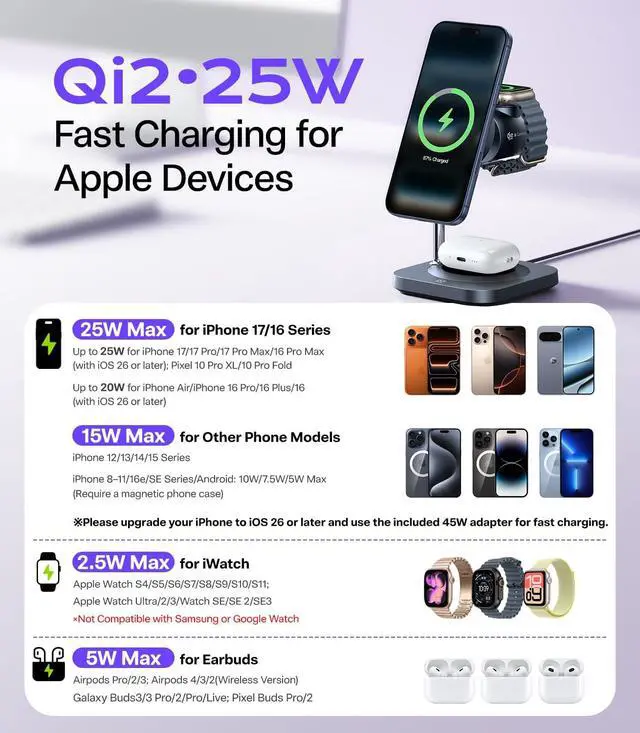 25W Max FAST MAGNETIC CHARGING: Our Qi2 25W magnetic charger provides 25W Max for iPhone 17 / 17 Pro / 17 Pro Max / 16 Pro Max (with iOS 26 or later) and Pixel 10 Pro XL / 10 Pro Fold; 20W Max for iPhone Air / 16 Pro / 16 Plus / 16; 15W Max for other phone models including iPhone 12 / 13 / 14 / 15 Series; 10W Max for iPhone 811 / 16e/ SE series and Android devices (magnetic case required); 2.5W Max for Apple Watch S11 / S10 / S9 / S8 / S7 / S6 / S5 / S4 / SE, Apple Watch Ultra 3 / 2 / 1, Apple Watch Nike+ / Hermes; 5W Max for AirPods Pro 3 / 2 / AirPods Pro / AirPods 3 / 4 / 2 (with Wireless Charging Case)
