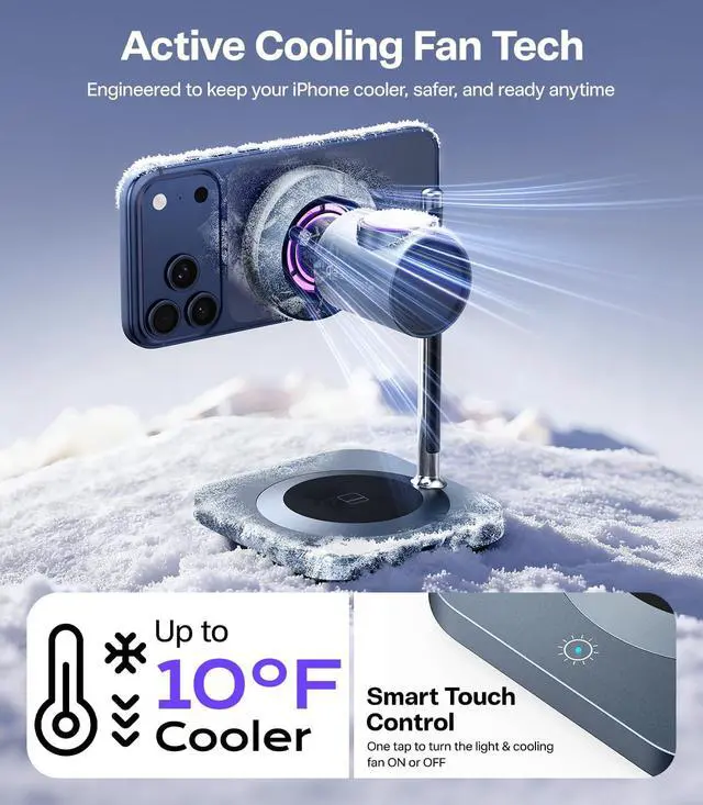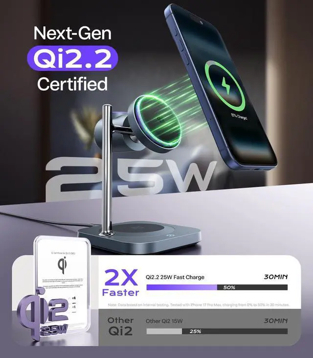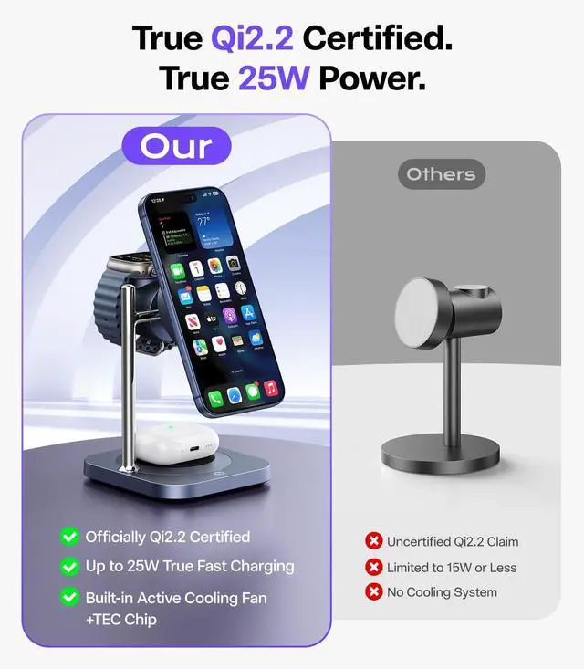 SLEEP-FRIENDLY & PREMIUM DESIGN: Charge silently at night with Sleep Modetouch once to turn off the fan and display while your devices continue charging. This 25w fast charging stand features a weighted, low-center-of-gravity base with non-slip material and a soft-touch phone pad for stable Qi2 wireless charging on any surface. Sleek, premium materials blend seamlessly with home or office setups