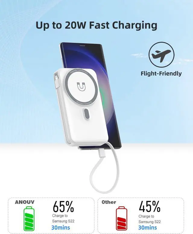 Devices Charging Simultaneously: Equipped with USB-C PD 20W fast charging output and USB-A 22.5W output, this wireless power bank can charge your iPhone up to 60% in just 30 minutes. The 10000mAh high-capacity battery offers up to 2 full charges for most iPhones, supports charging up to 4 devices at the same time, shared charging with no waiting