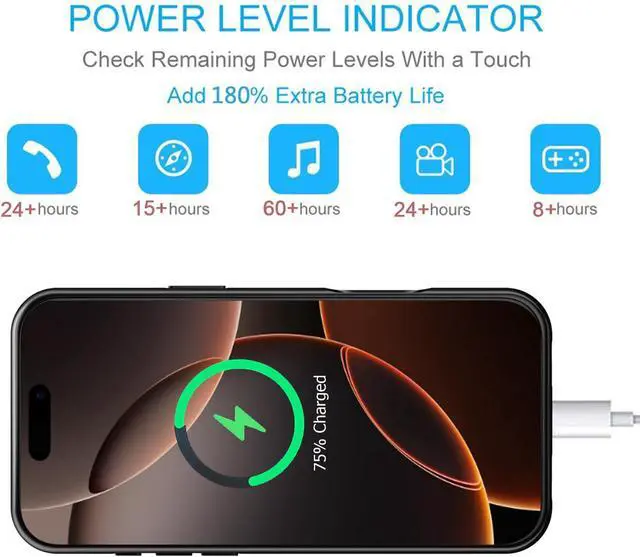Simple To UseAll-in-One charging case makes installation and carry much easier and safer. Equipped with power level indicator LED lights, just press the button for 3 seconds to start or stop charging. 4 LED battery level indicators that let you know how much power you have (0--25%--50%--75%--100%).
