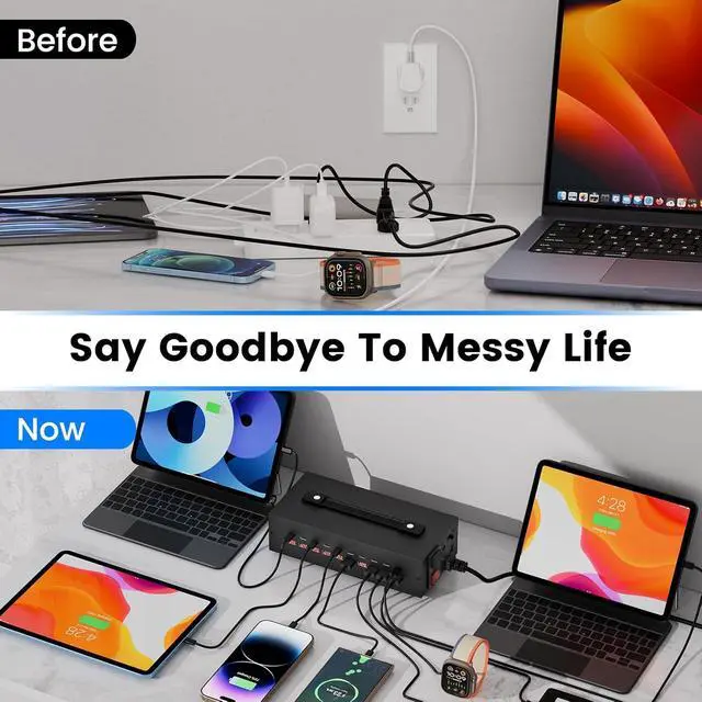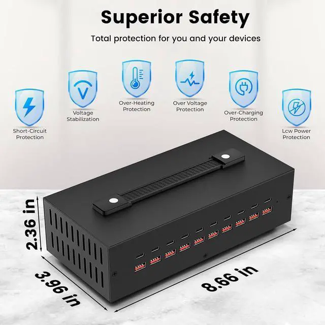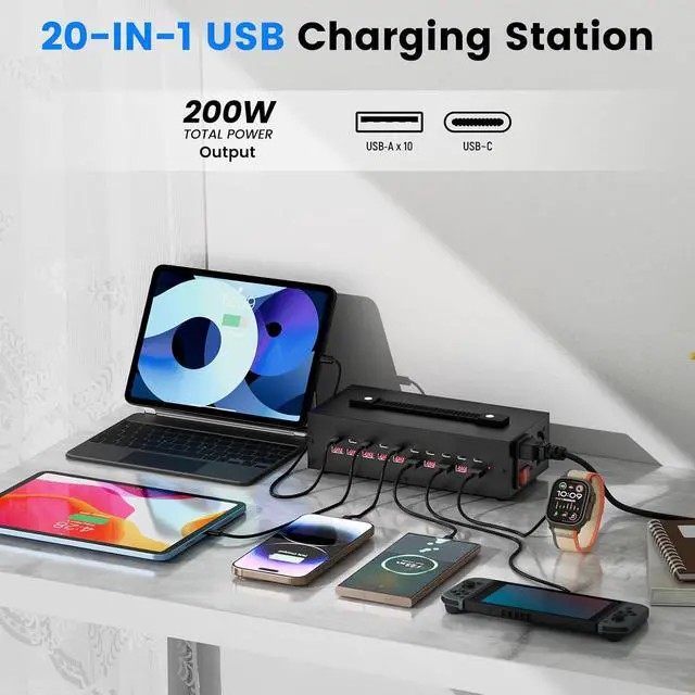 SAFE AND SECURE CHARGER - The charging station for multiple devices has a built-in smart chip to prevent overvoltage, overcurrent, overload and short-circuit. Fan cooling can effectively dissipate heat and prevent overheating. MultiProtect safety system provide 100% comprehensive protection for you and your devices.
