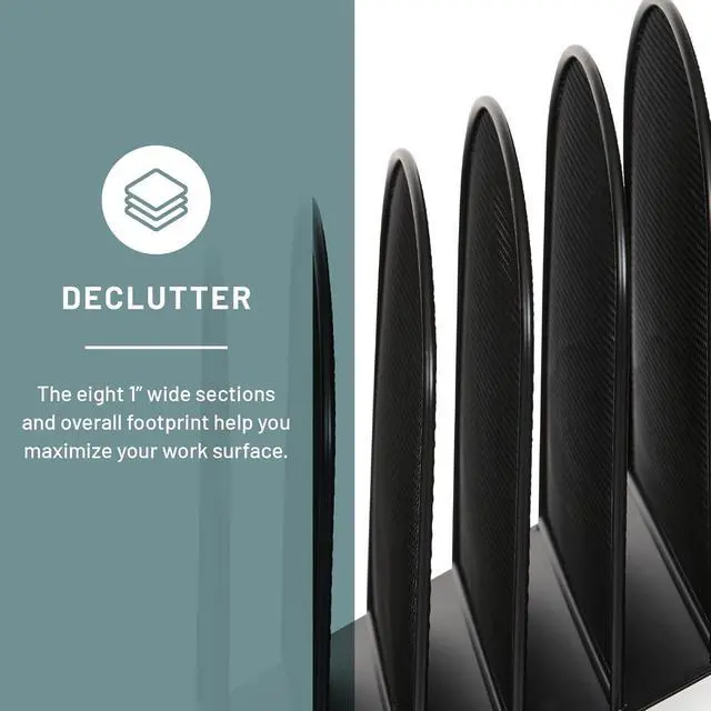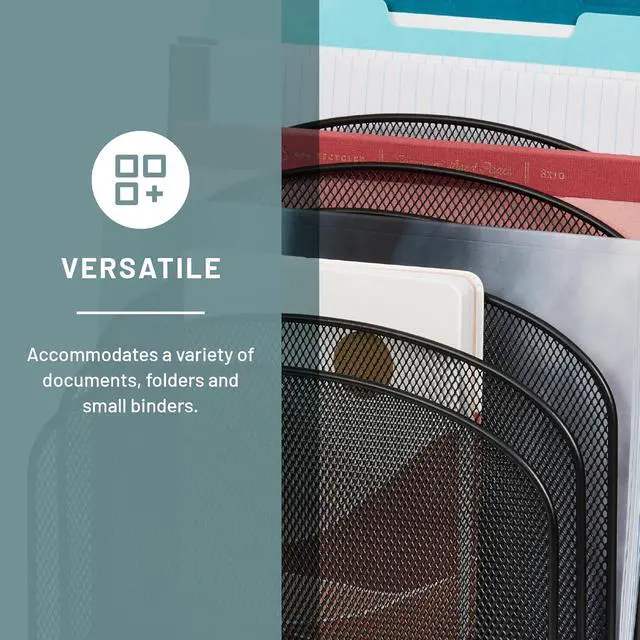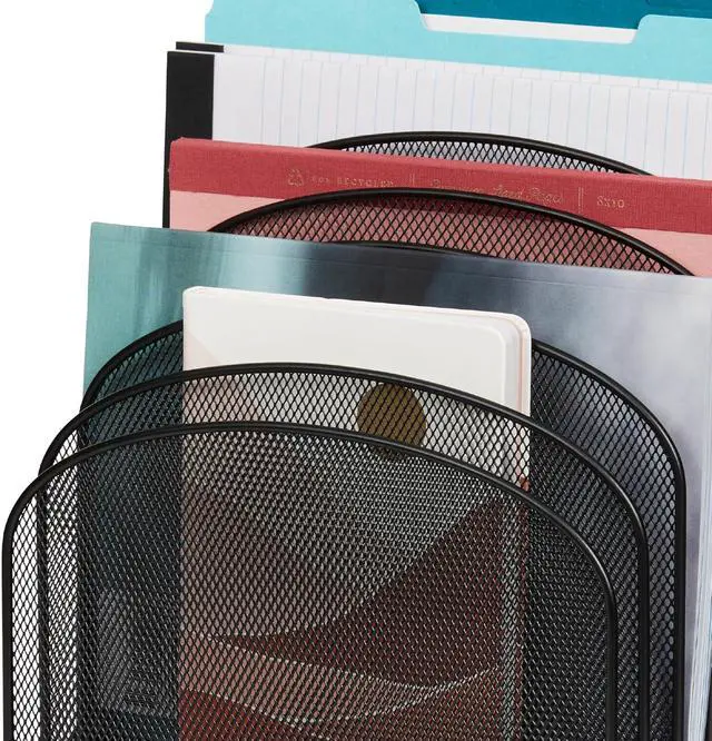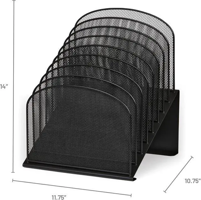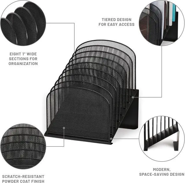 Onyx Mesh 8-Tier Vertical Desktop Organizer keeps essential files and documents visible, securely organized and within easy reach. The commercial-grade mesh steel provides strength and stability while the powder coat finish helps resist chipping and scratching for extended use. Eight 2" wide tiered sections hold file folders, cookbooks, homework, journals, and binders. Place it in business and home offices, small cubicles, mailrooms, school rooms, hobby rooms, work desks and communal tables for a long-lasting workspace organization solution. The Onyx Family includes a diverse collection of stylishly-designed steel mesh products, from desktop organizers to machine stands.