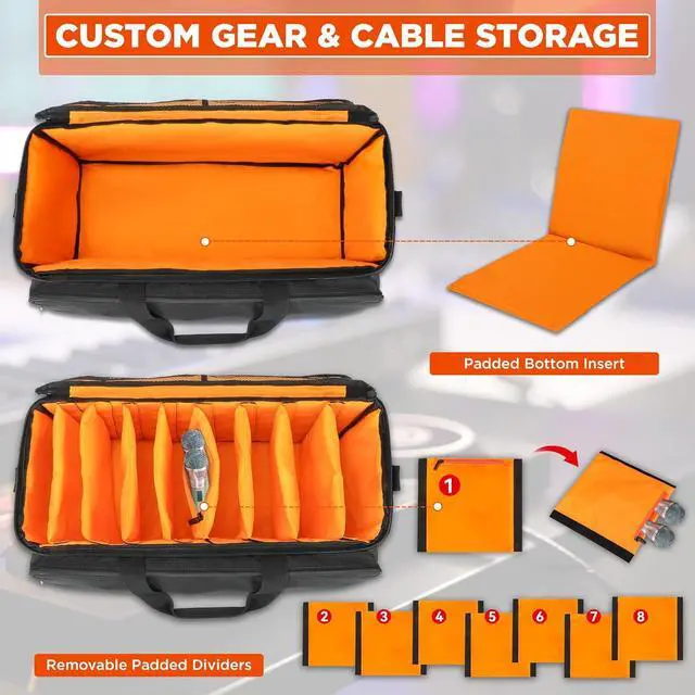 High-Visibility Interior - Fluorescent orange liner enhances visibility in low light, perfect for finding cords, mics, and pedals in this cable management bag during stage setups.