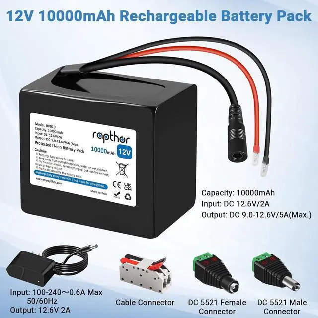 This 10000mAh lithium ion battery pack with DC 9.0 - 12.6V /5A (Max) output, the input is DC 12.6V /2A. It comes with 12.6V /2A Charger, DC 5521 female and male connector and cable connector, great choice to do the DIY projects.