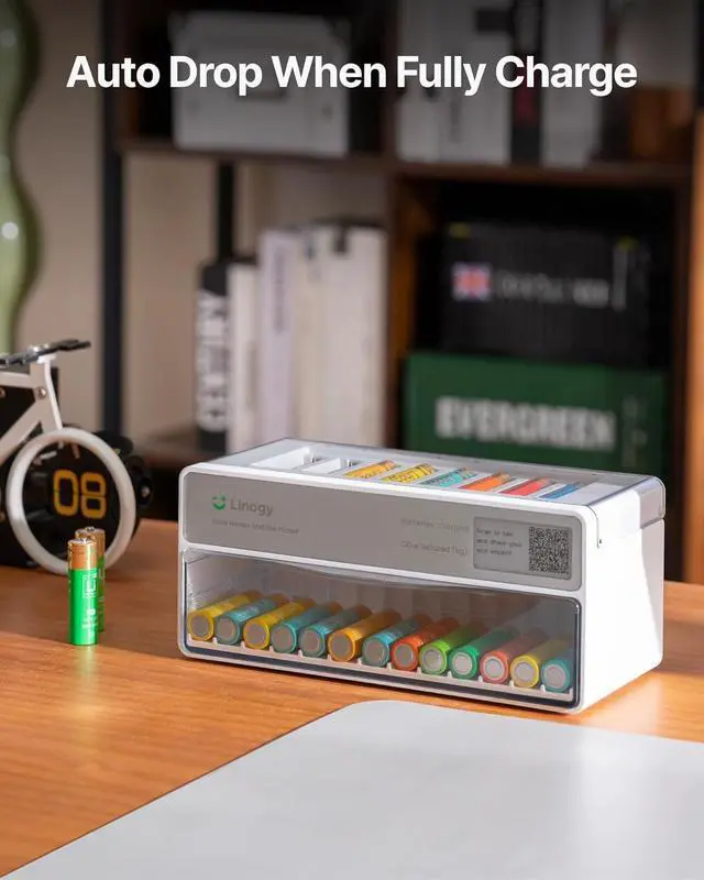 Auto-Drop Smart Sorting System Fully charged batteries automatically drop into the storage bin, separating them from empty ones. This prevents overcharging and ensures you grab a fresh battery instantly.